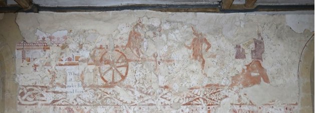 Above the upper border in the centre of the south wall is a scene that may depict DEVILS PULLING A HANDCART with faint traces of figures in the cart; the scene is probably a warning of the Torments of the damned in Hell. The much later painting on the West Wall showing a skeleton, its message much the same. Clive Rouse found it difficult to see how the devils and the handcart fitted into the various schemes. It is pre-Reformation. Though highly unlikely to have been painted at the same time as the Cycle of St James, it is painted on the same skin of lime wash as that of the Cycle of St James but unlikely to be as old.