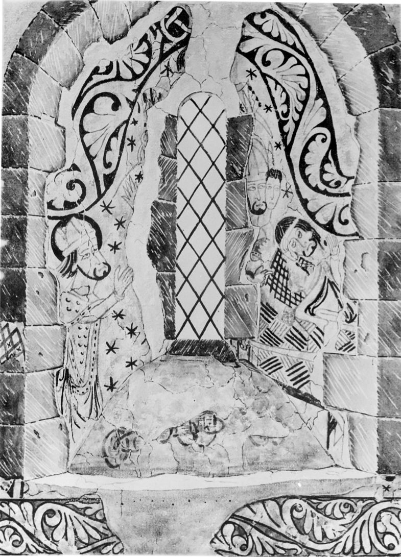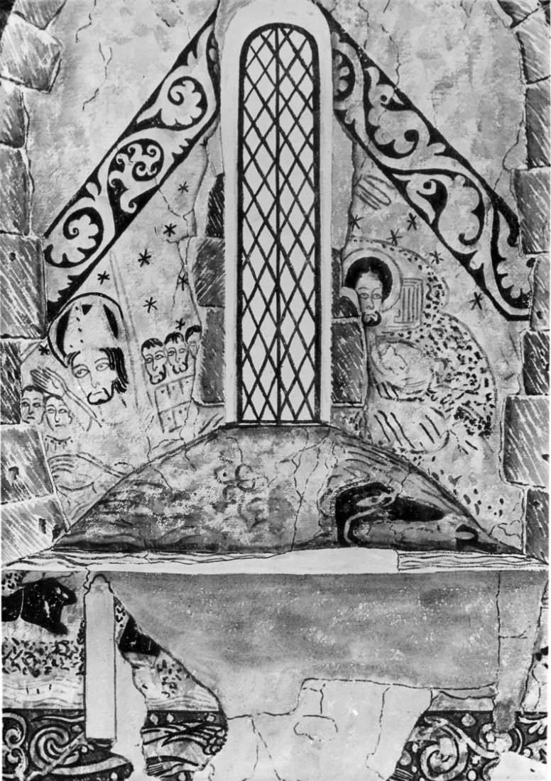 The paintings at the east end of the south wall have been destroyed; destroyed by damage to the plaster and by the insertion of a late medieval window. Scenes may have shown James preaching in Judea, as at Chartes, and of Hermogenes, the magician, sending his disciple Philetus to confront James.