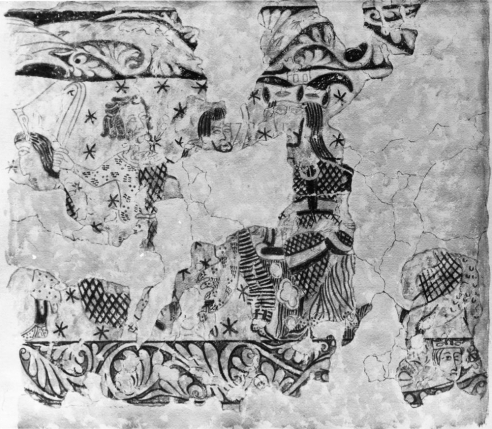 To the right of the boat scene, scene 16, a second fantastic figure, similar to the figure in scene 14, is apparently addressing a figure opposite to him of which little remains. Who are these mysterious figures in patterned cloaks? Are they evil-doers or familiar spirits, former associates of Hermogenes?